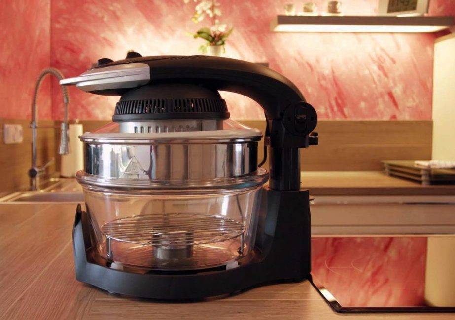 Эта бытовая техника внешне похожа на мультиварку. Она имеет в большинстве случаев стеклянный корпус и массивную крышку, в которой установлена мощная галогенная лампа для нагрева продуктов питания, вентилятор с регулируемыми оборотами, а также металлическая решетка для защиты от брызг.