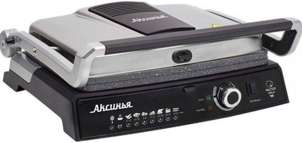 - GFX 18870-56RussellHobbsFam — корпус — закрытый, АПП, ножки способны регулироваться по высоте, каналы для сбора жидкости. Мощность — 1,6 кВт. Можно готовить кусочки толстые и тонкие. Имеется в наличии индикация включения прибора и температуры рабочей поверхности.