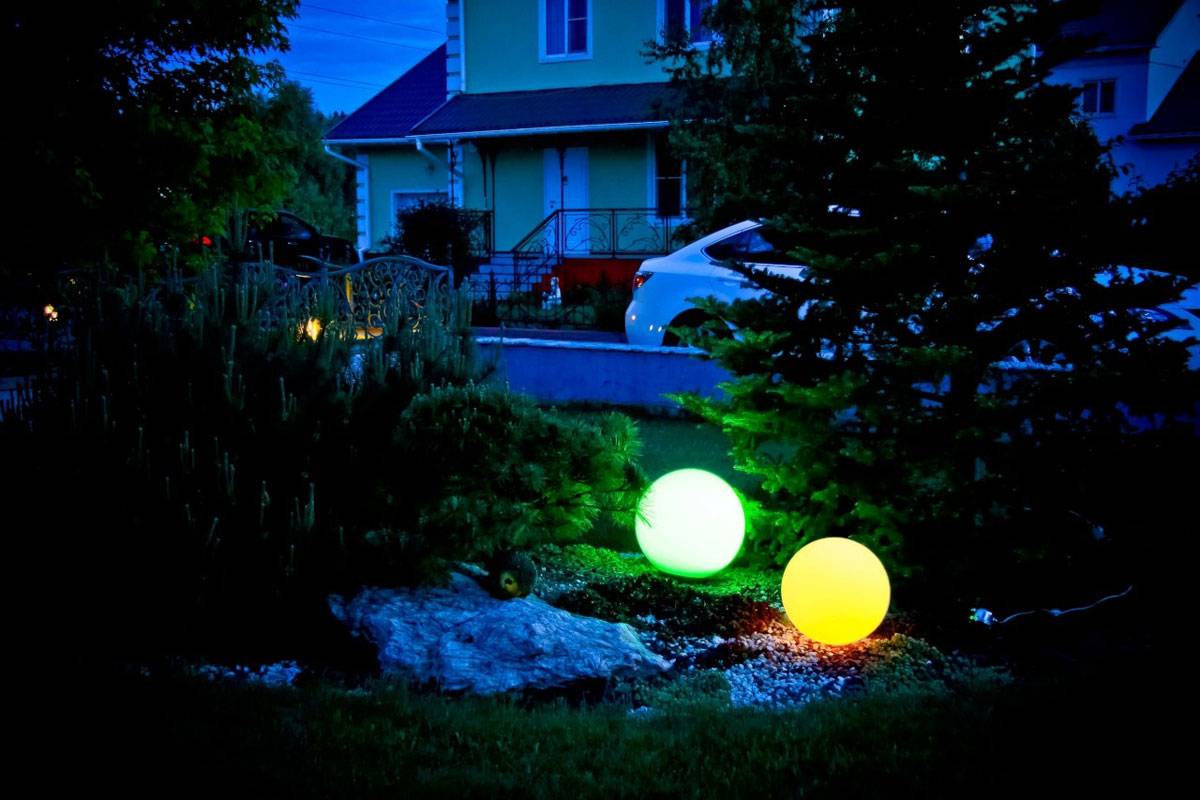 Последний вид приборов имеет стоимость сравнительно небольшую и их удобно устанавливать в большом числе вдоль дорожек, бассейна, по периметру усадьбы. Всегда очень декоративный вид у уличных светильников шаров на солнечных батареях, имеющих различную расцветку и размеры.