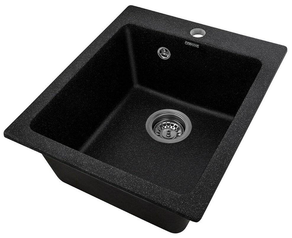 Наш рейтинг лучших гранитных моек открывается моделью Gerhans A10. Выполненная в черном цвете, однокамерная, она прекрасно дополнит любую кухню — как темную, так и белую. В случае последнего это дает большой контраст. Это разновидность встраиваемой мойки, а это значит, что после установки она будет образовывать однородную поверхность вместе с окружающей столешницей.