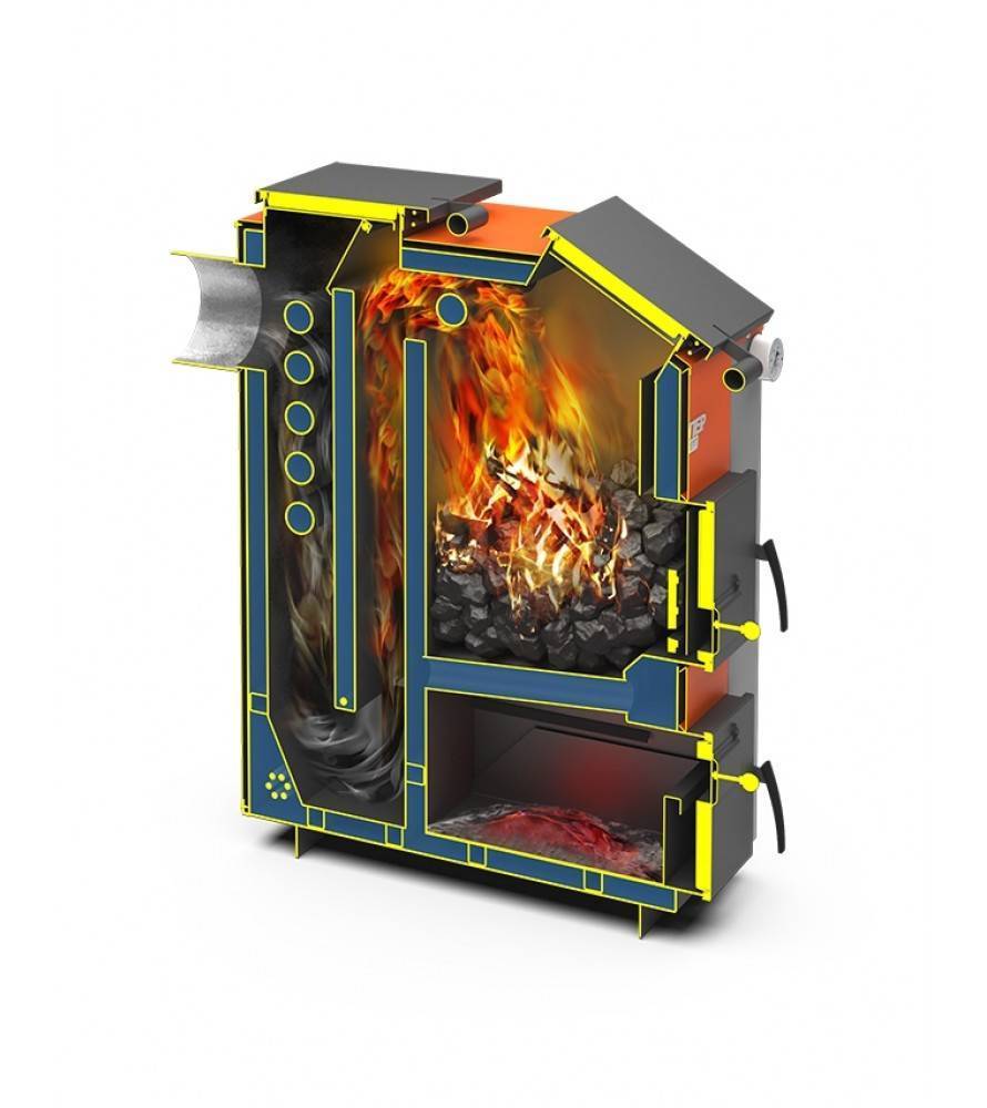 Горение происходит на колосниковых решётках, через которые проходит воздух. Топливо горит во всём объёме, интенсивность пламени регулируется подачей воздуха через зольную дверцу.