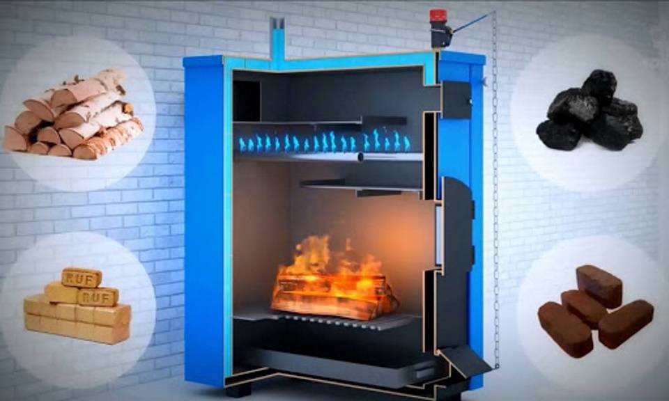 Продолжительность горения зависит от увеличенной топливной камеры в котле, именно её размер оказывает влияние на процесс: чем больше закладываемых в топку дров, тем дольше они будут гореть и выделять тепло. Бытовые агрегаты могут работать 10—12 часов с одной закладкой дров, а с порцией угля до суток. Существуют такие виды твердотопливных котлов: