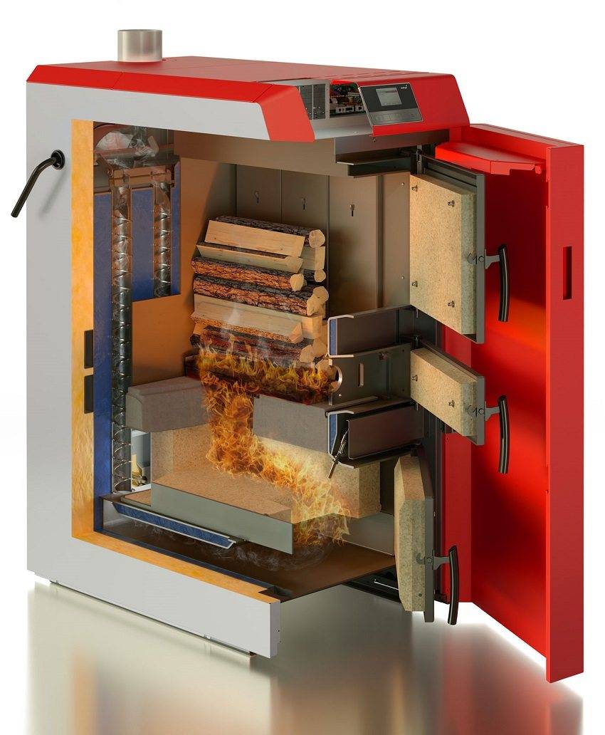 , котлы для отопления на дровах и твердом топливе потеряли свою популярность из-за худших эксплуатационных характеристик. Ведь дрова в котле быстро сгорают, и топливо нужно добавлять каждые три-четыре часа. Конструкторы создавали системы автоматической подачи топлива, но такие устройства работали надежно только с марками топлива мелких фракций – пеллетами, угольной крошкой и т.д. Дрова и крупные куски угля они не могли подавать в топку котла.