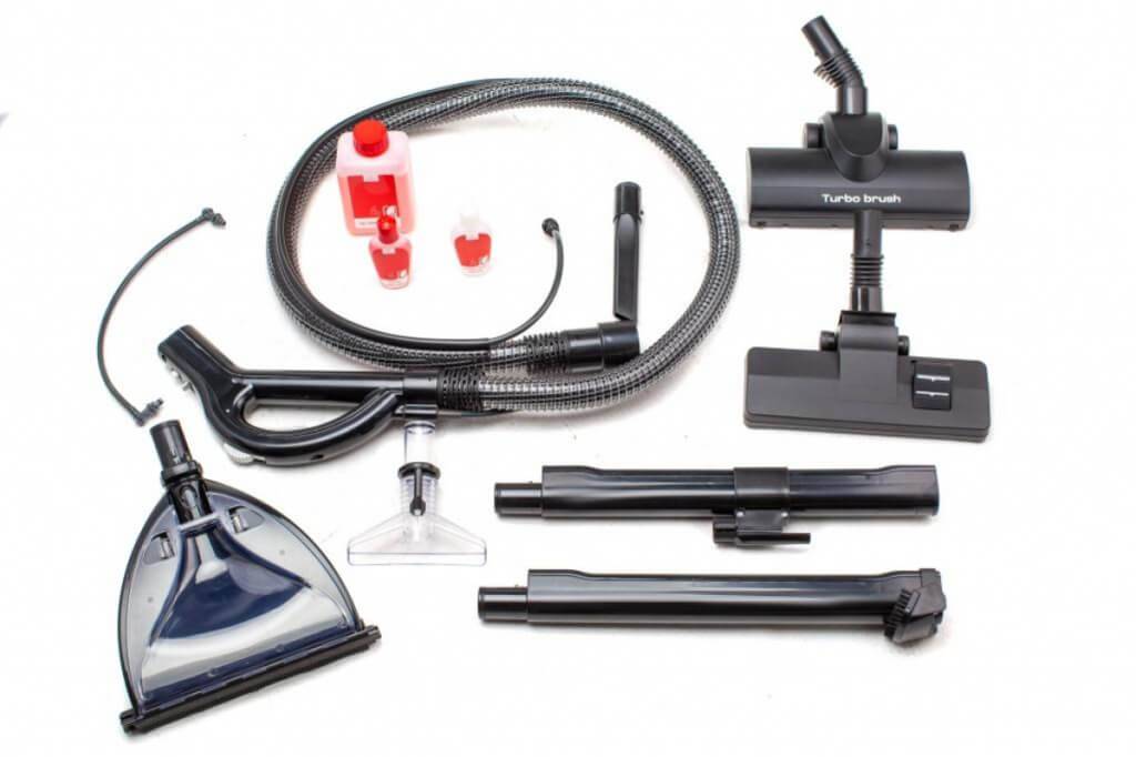 В комплекте вместе с пылесосом идут: щелевая насадка, 2 насадки для мягкой мебели (суха и влажная уборка), моющая насадка для ковров, переключаемая насадка для проведения сухой уборки, насадка моющая с откидным адаптером для очистки пола и специальный концентрат.