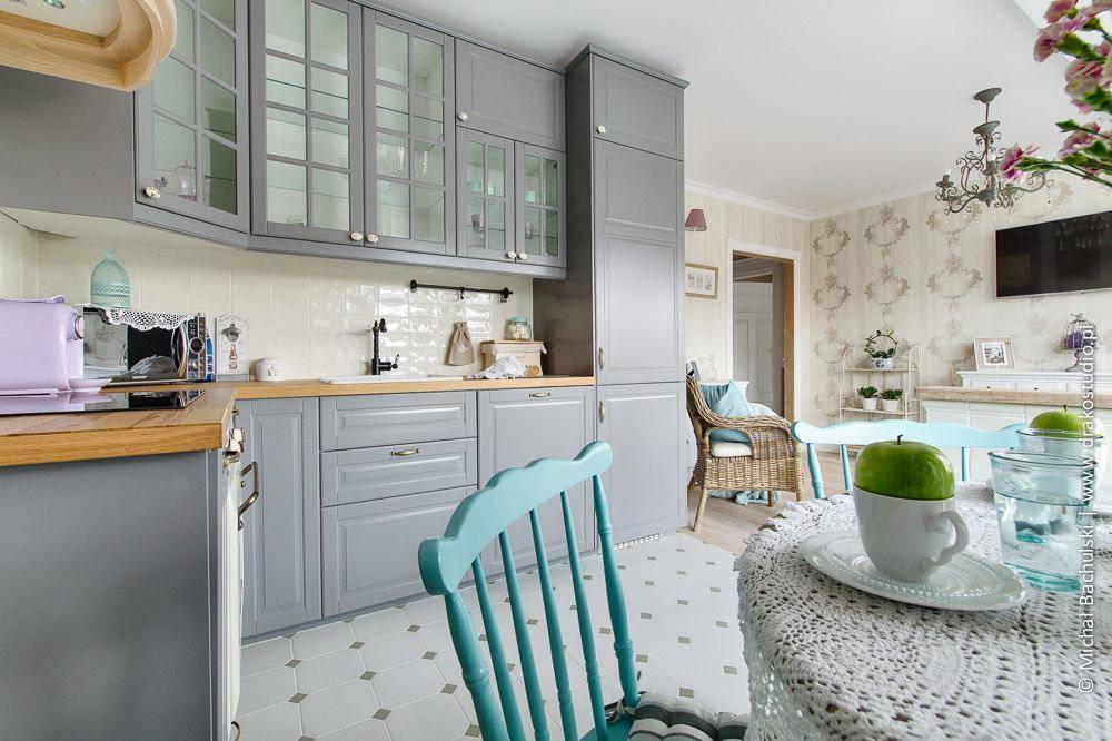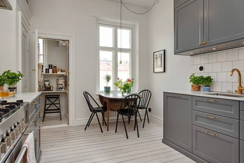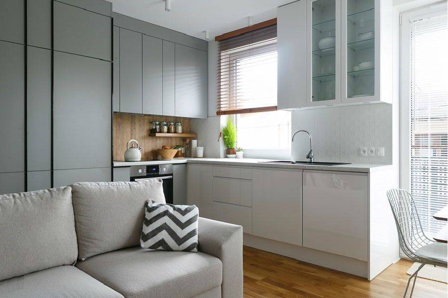 Если однотонная отделка маленькой кухни вам показалась скучной, просто учитывайте цветовые акценты — плинтуса, контрастные полосы обоев или купите материал с интересной фактурной поверхностью. Гарантируем, что в таком интерьере вам не будет скучно!