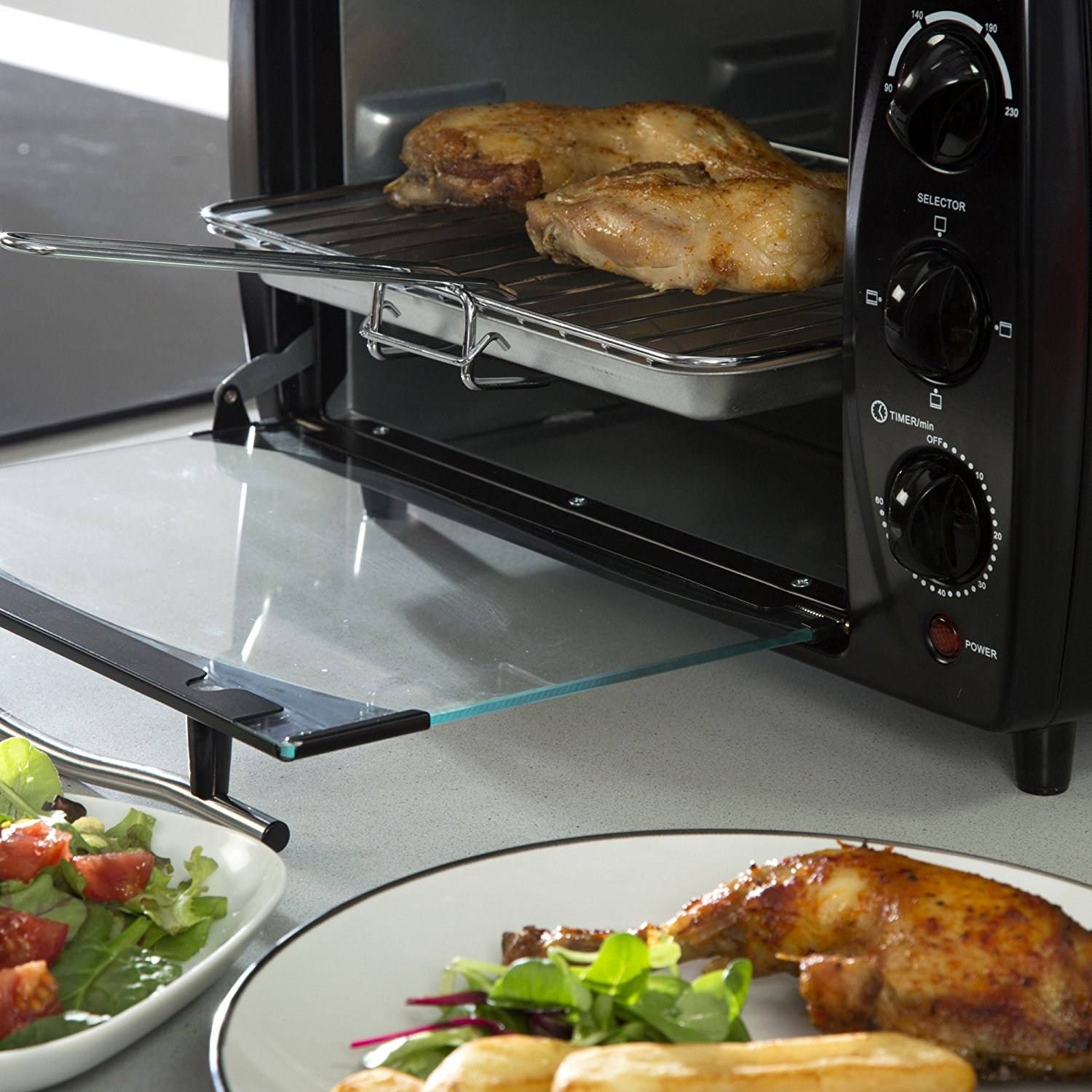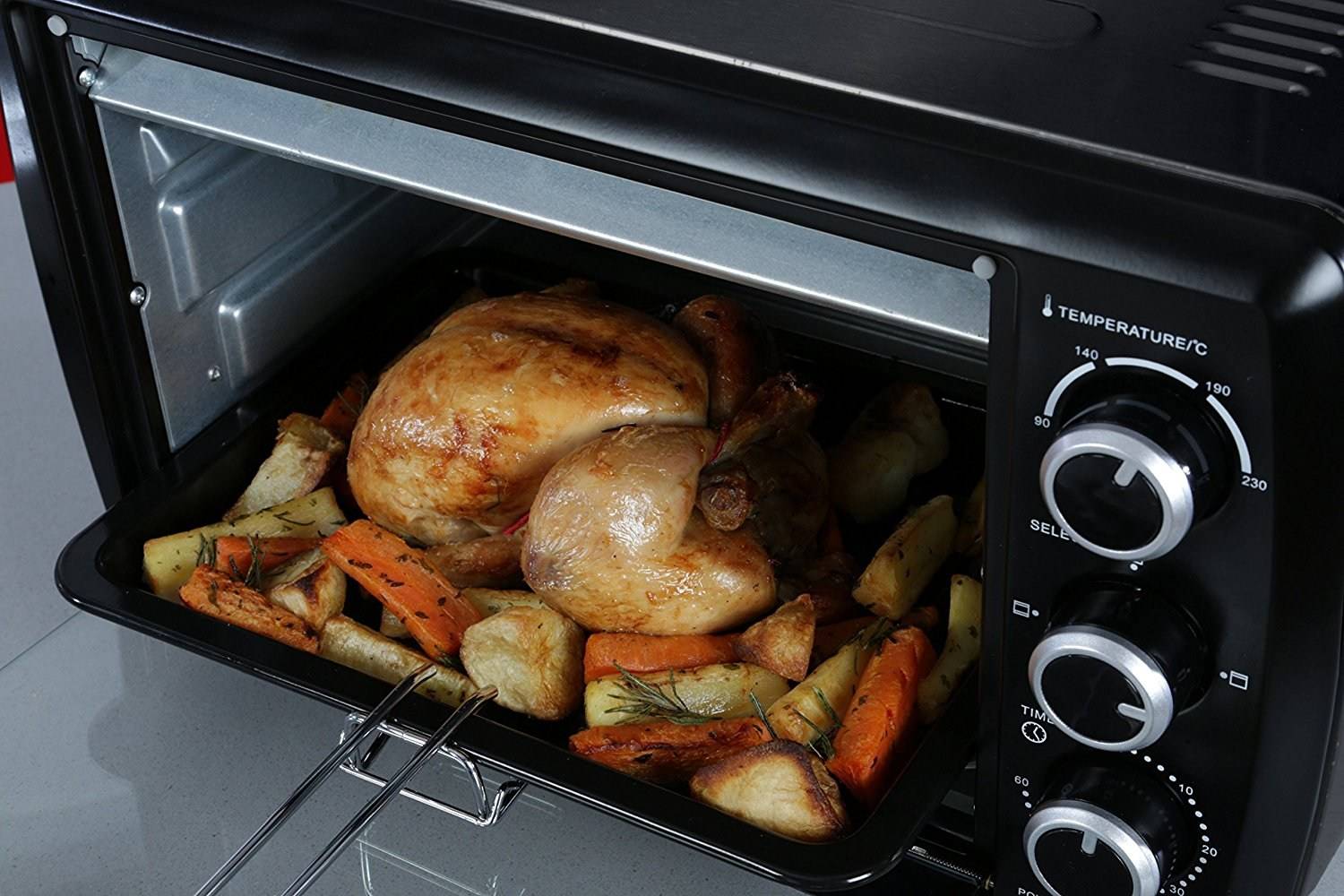 Настольная мини-духовка довольно компактна, хотя для уменьшения размеров производителю пришлось убрать некоторые функции по сравнению с более объемными моделями. Вместительность этой печи составляет 23 л. Открывание двери откидного типа, управление – механическое, а размеры 46×28×39 см. Прибор комплектуется решеткой, вертелом, сковородой, поддоном для крошек, а также специальными ручками для безопасного изъятия аксессуаров.