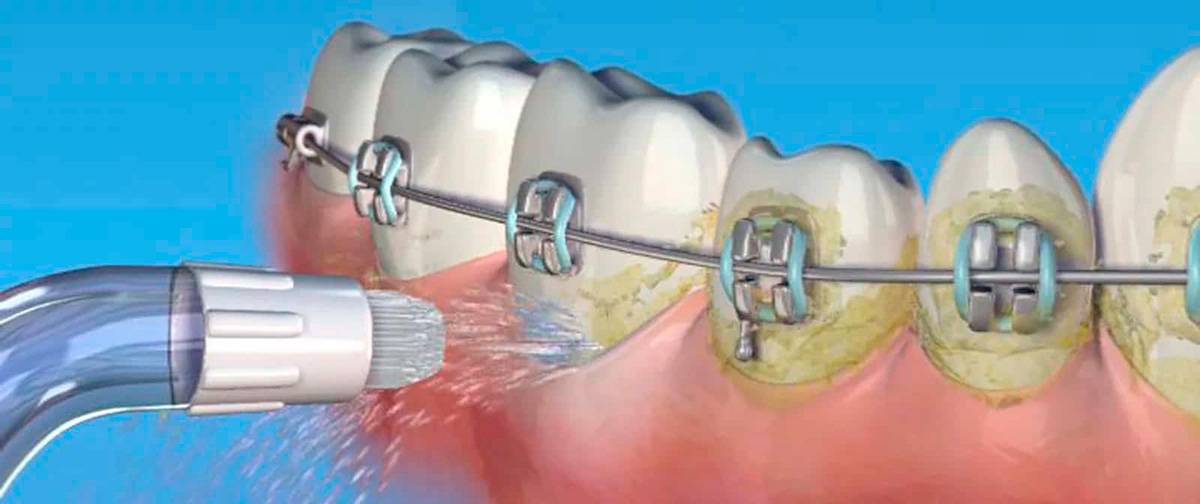 Ирригатор с ортодонтической насадкой позволяет эффективно промыть брекеты со всех сторон