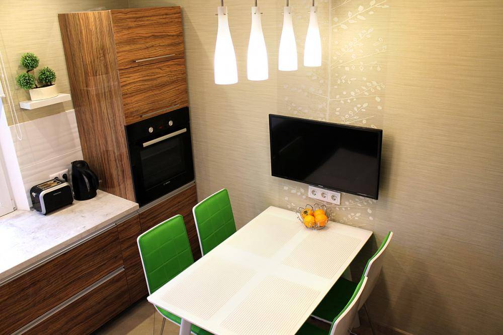 - Если кухня просторная и ее площадь более 16 м. кв., можно смело экспериментировать и заказывать модель телевизора с диагональю от 32 дюймов.