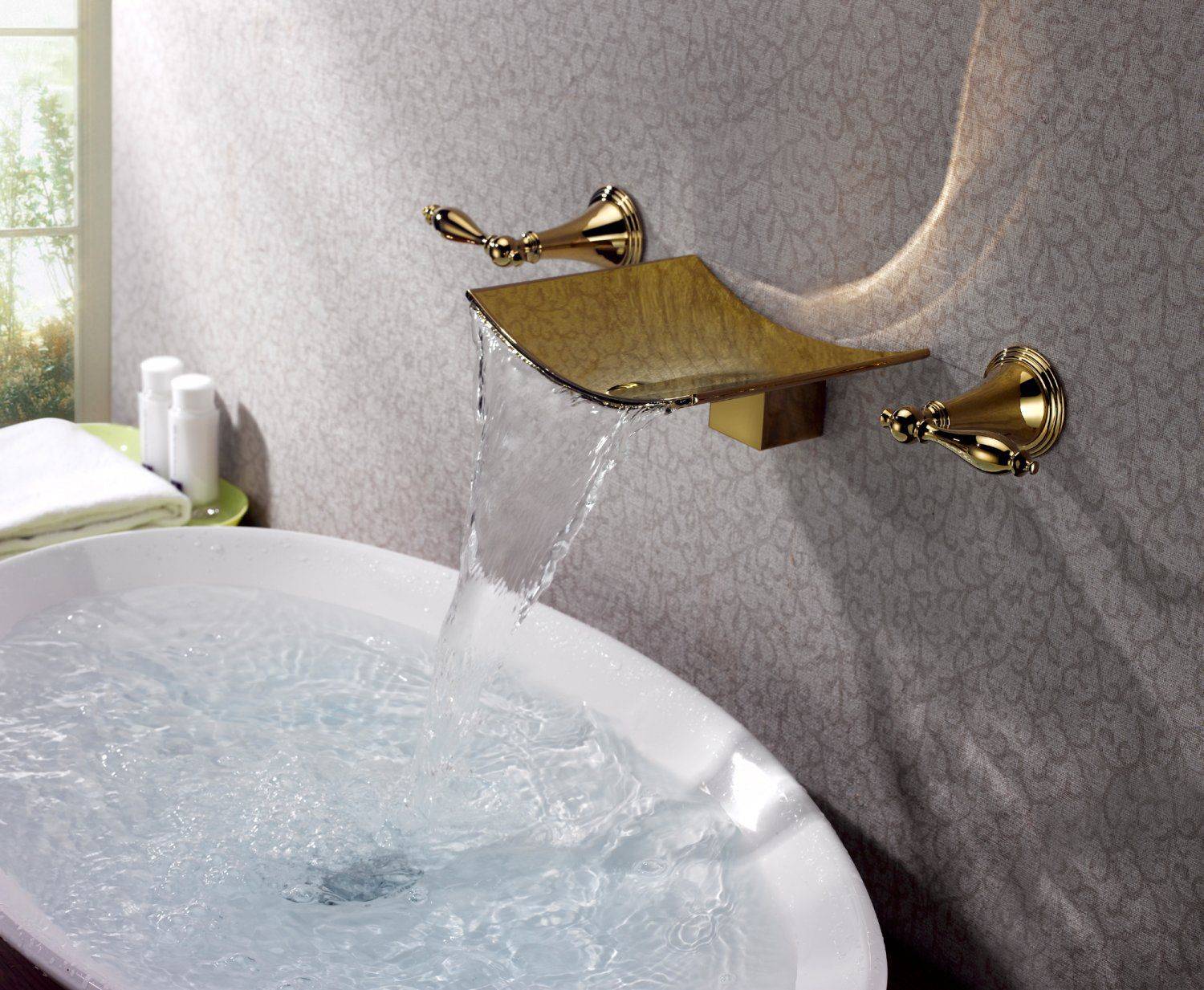 Имеется в продаже также настенный кран с каскадным широким изливом, его лейку устанавливают на стену, заранее подбирая удобную высоту. В данном случае подвод воды прячут за декоративной панелью или отделкой