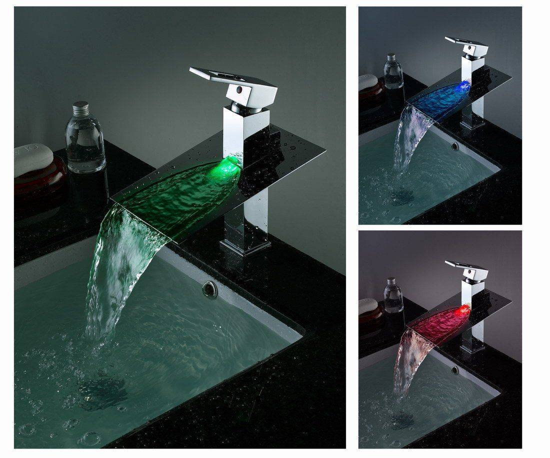 Отличаются каскадные устройства и дизайном. Они выпускаются в различной форме: в виде овальной или круглой тарелки, прямоугольника или квадрата, имеют изогнутые или прямые пластины. Кроме этого, водопад может быть как высоким, так укороченным. Огромным спросом пользуется кран с led-подсветкой, его струя красиво освещается и может менять цвет в зависимости от температуры подачи воды. Красиво смотрятся в современном интерьере и смесители с полками, которые служат не только предметом декора, но и позволяют удобно размещать различные предметы гигиены.