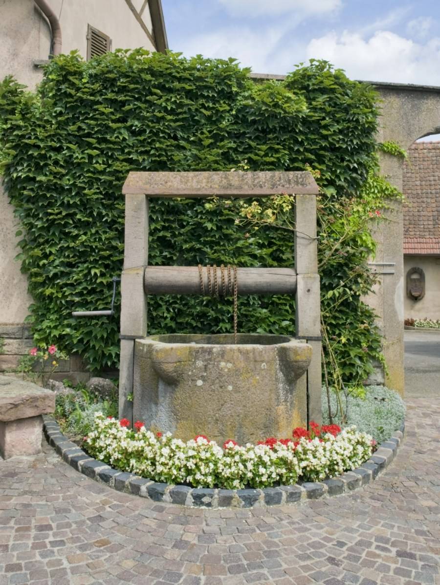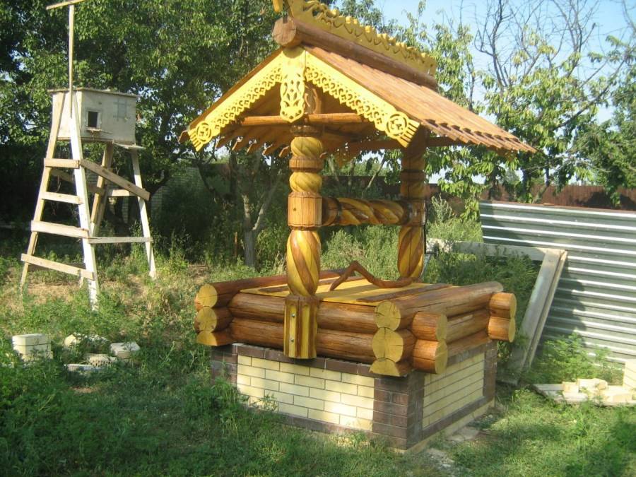 - оголовок – это наземная часть постройки, которая служит не только в декоративных целях, но и защищает воду от замерзания и попадания в нее пыли и мусора. Оголовок делается из бетона, камня, кирпича, а классический вид – из дерева (бревен);