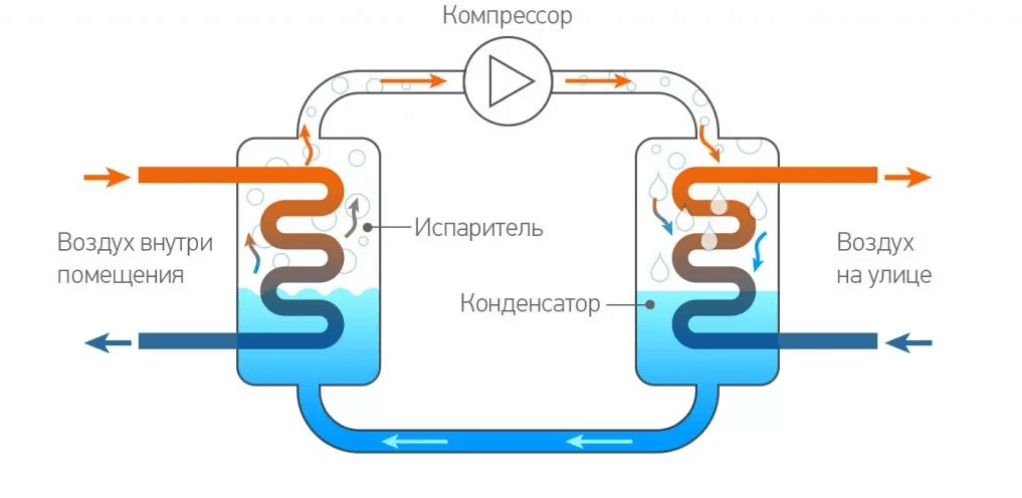 При работе холодильника воздух остужается внутри агрегата, а тепло выводится в комнату. Моноблок работает так же: понижая температуру в помещении, отдает излишки тепла улице.