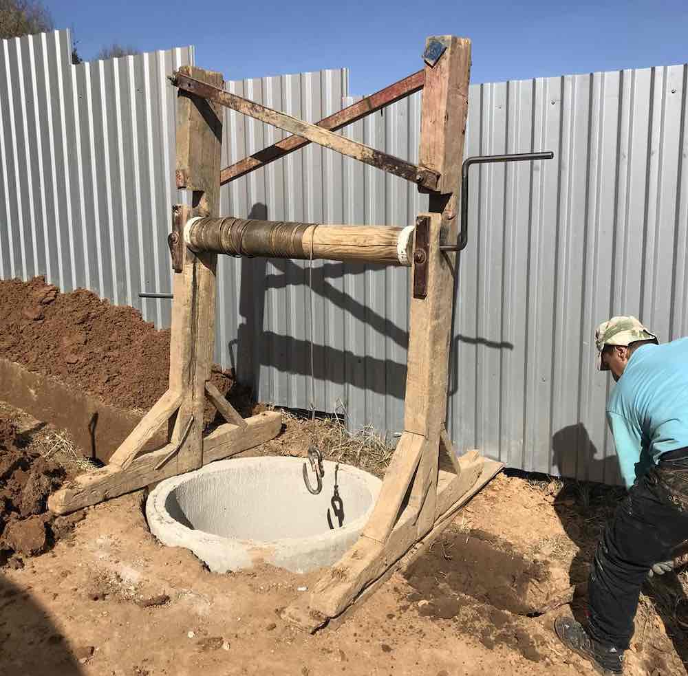 - В момент, когда верхняя часть кольца сравняется с поверхностью земли, грунт подают на поверхность с помощью блока, веревки и ведра.
