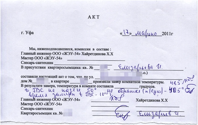 Независимо от того, куда именно вы обращаетесь при отсутствии в доме тепла, сама жалоба должна быть составлена по сути вопроса. При отсутствии надлежащего отопления стоит указать фактические параметры температурного режима вашей квартиры. Если температура не соответствует СанПиН 2.1.2.2645-10, требуйте проведения официального замера температуры. Как правило, подобные обращения, составленные юридически грамотно, с отсылкой к законодательным нормам и стандартам, принимаются к рассмотрению на порядок быстрее.
