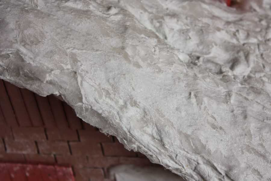Для начала нужно сделать небольшой картонный домик. Склеив все детали конструкции из гофрированного картона, можно доставать монтажную пену. Начиная со стен, ее нужно наносить на картон по горизонтали. Застывая, пена образует объемные деревянные бревна. Покрыть бревнами нужно стены и крышу избушки.