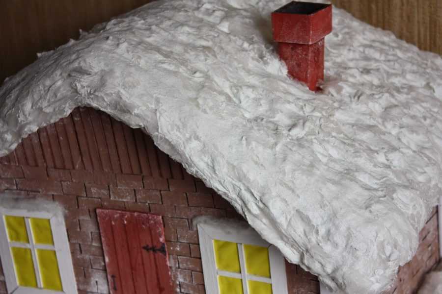 После того, как пена полностью застынет, можно приступать к покраске домика. Его можно покрасить коричневой краской, повторяя цвет дерева или создать зимнее настроение и сделать избушку заснеженной при помощи белой или серебристой краски.