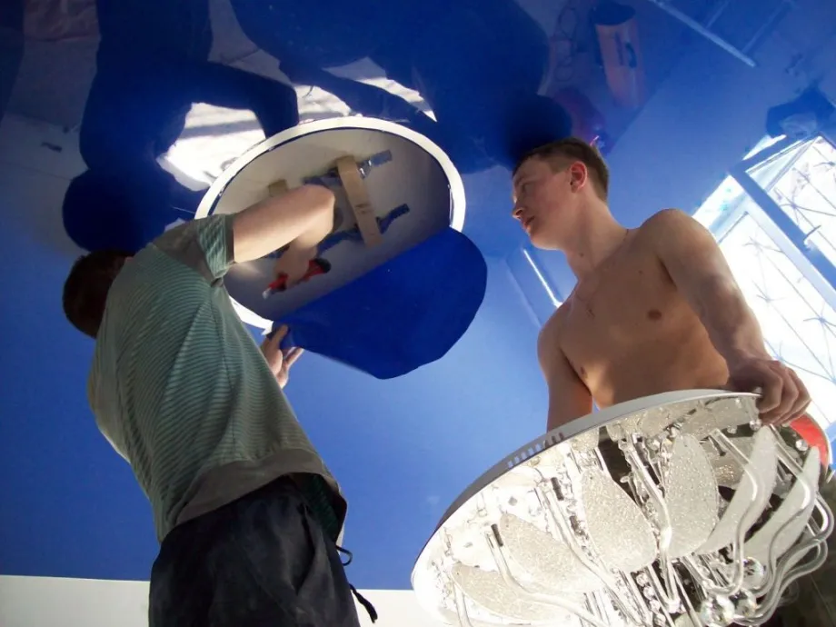 Важно не повредить при этом полотно и надежно закрепить светильник, а также правильно подключить его. Если у вас нет навыков проведения электромонтажных работ, монтаж люстры можно выполнить самостоятельно, а подключение лучше доверить профессионалу – от этого зависит не только ваша безопасность, но и долговечность потолка
