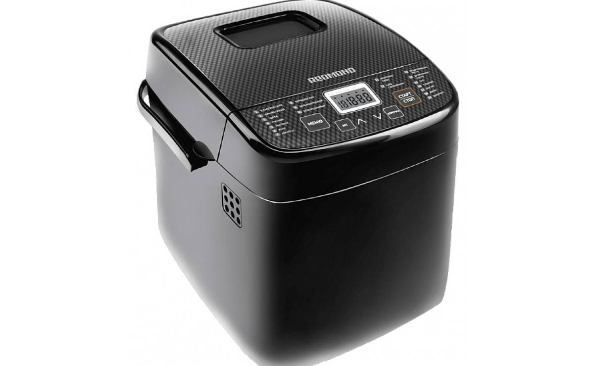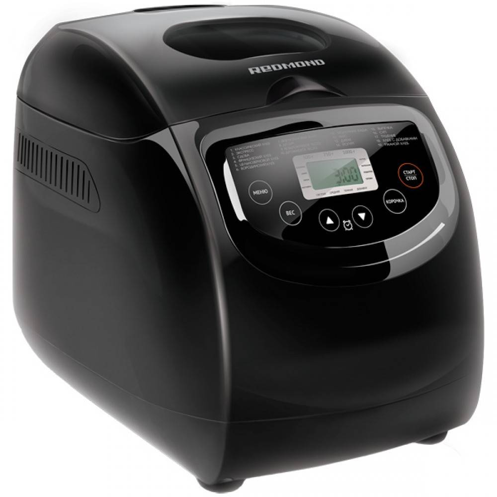 Хлебопечка «Редмонд» М1913 отличается необычным дизайном. Панель управления расположена спереди, а на крышке смотровое окошко. Блестящий черный корпус с обтекаемыми формами удачно впишется в любую кухню.