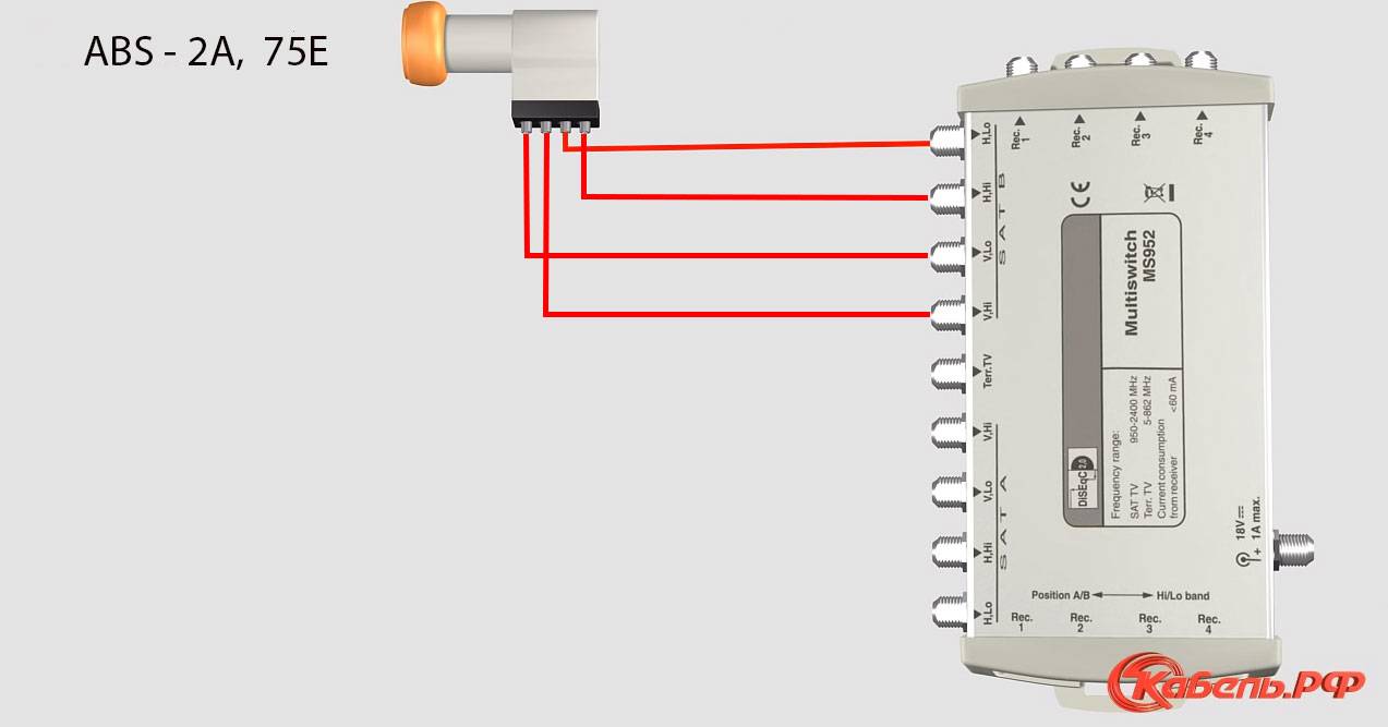 Схема подключения через мультисвитч спутника ABS-2A для приема пакета каналов от МТС: