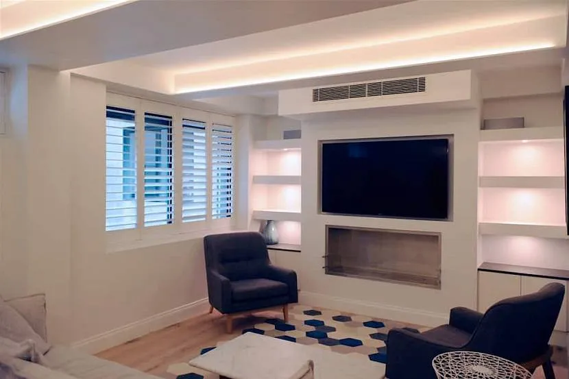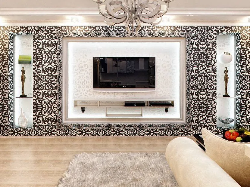 - Создание архитектурных композиций по всей стене, где располагается телевизор, домашний кинотеатр и другие медиаприборы.