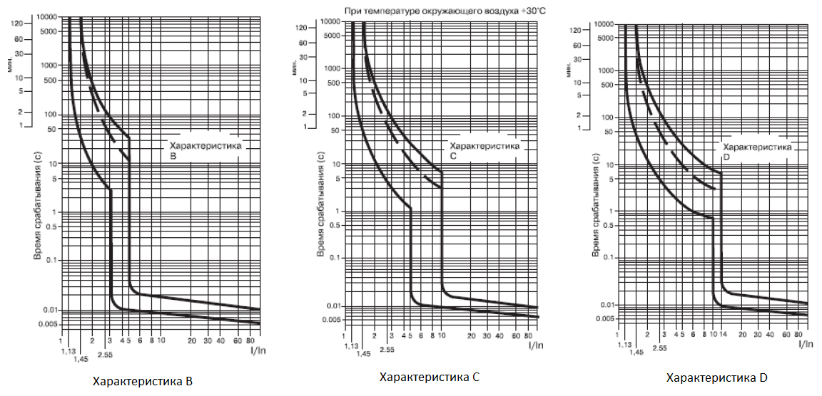 Существуют разные типы кривых времятоковых характеристик, обозначаются они латинскими буквами: A, B, C, D… Начиная с A и далее происходит постепенное загрубление чувствительности устройства. Например, тип «B» означает срабатывание электромагнитного расцепителя при 3–4 кратном превышении тока, тип «C» при 5–7 кратном, «D» при 10-ти кратном. Тепловой расцепитель будет срабатывать одинаковым образом у разных типов времятоковых характеристик.