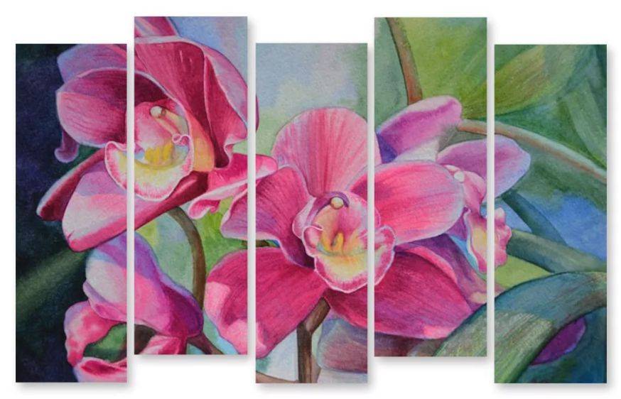 Обратите внимание, что на фото показана композиция, состоящая из пяти элементов, как одна из часто используемых. Поэтому вопрос, как повесить модульную картину из 5 частей, встречается достаточно часто