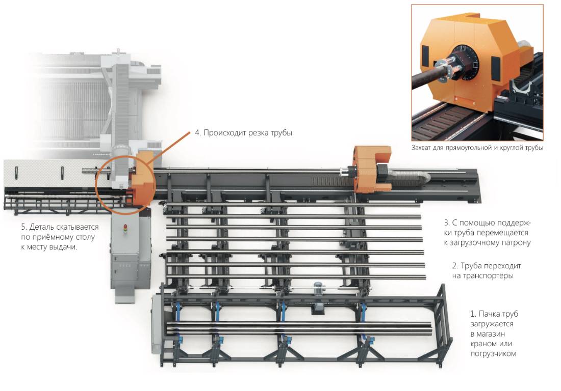 Резка трубы лазером выполняется в автоматическом режиме. Станки выполняют несколько операций одновременно, позволяют обрабатывать кромки, сверлить, фрезеровать. На станках обрабатывают материалы с толщиной стенки до 6,4 мм, длиной до 6,5 мм.