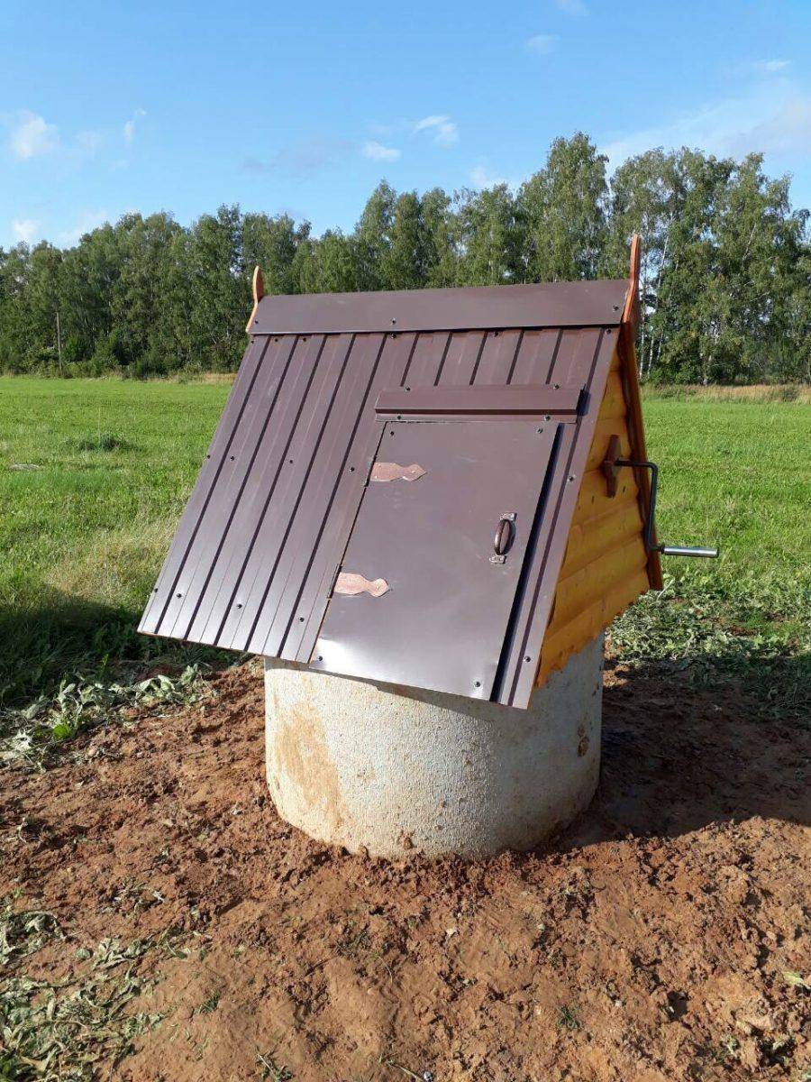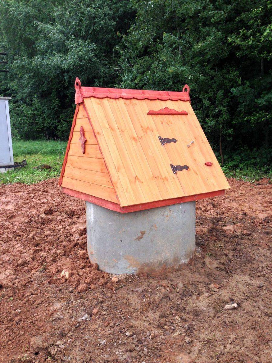 Верхний край последнего кольца, обычно расположен на 0,8 м над уровнем земли. Завершение конструкции носит название — оголовок. Его оформляют в зависимости от фантазии и функций соорудив полку с люком и крышу. Здесь можно оборудовать ворот с верёвкой (цепью) и ведром для механического поднятия воды. Разместить ручной насос, или насосную станцию, в этом случае необходим шланг или трубы для захвата воды.