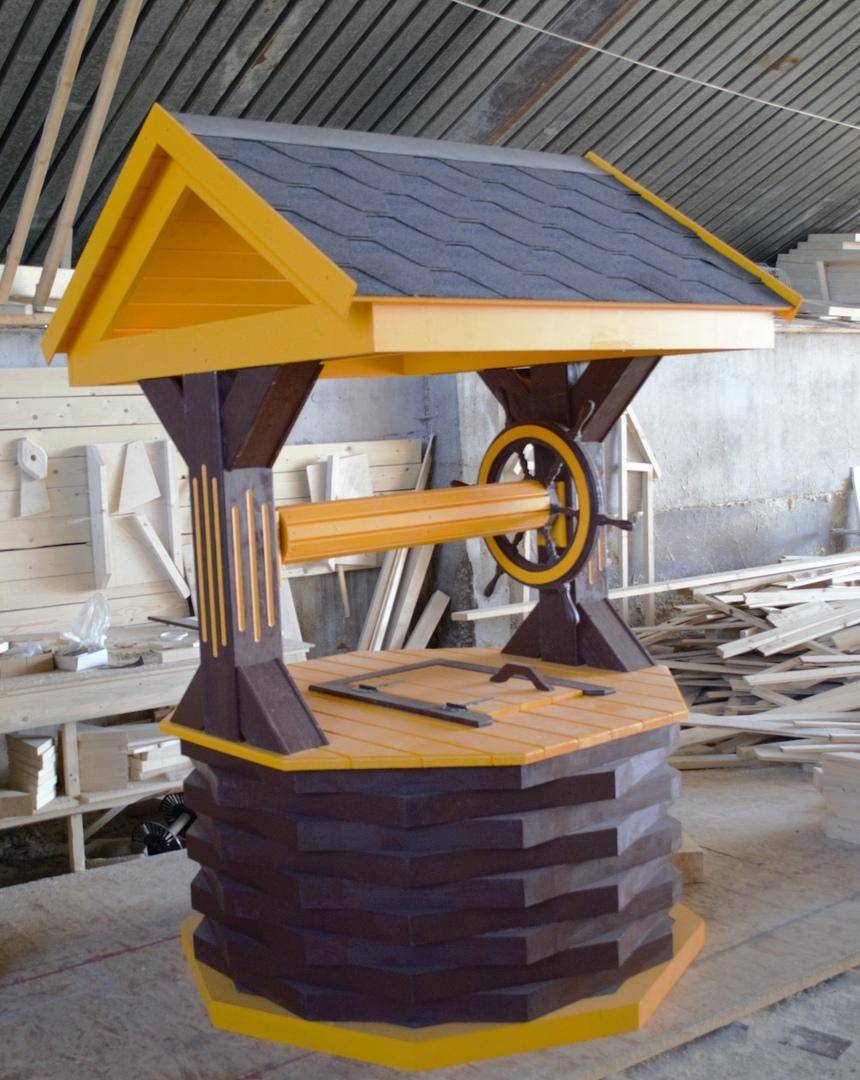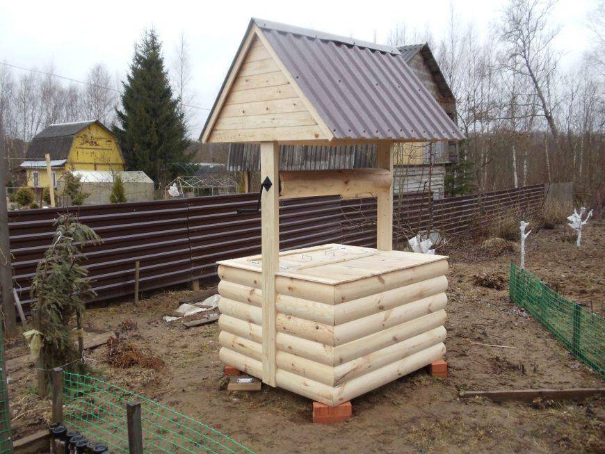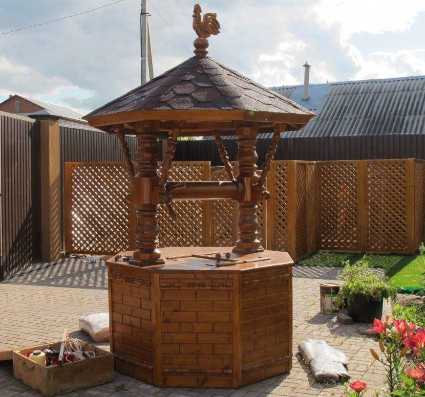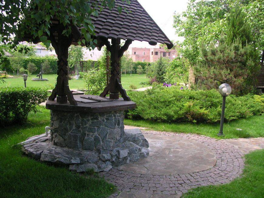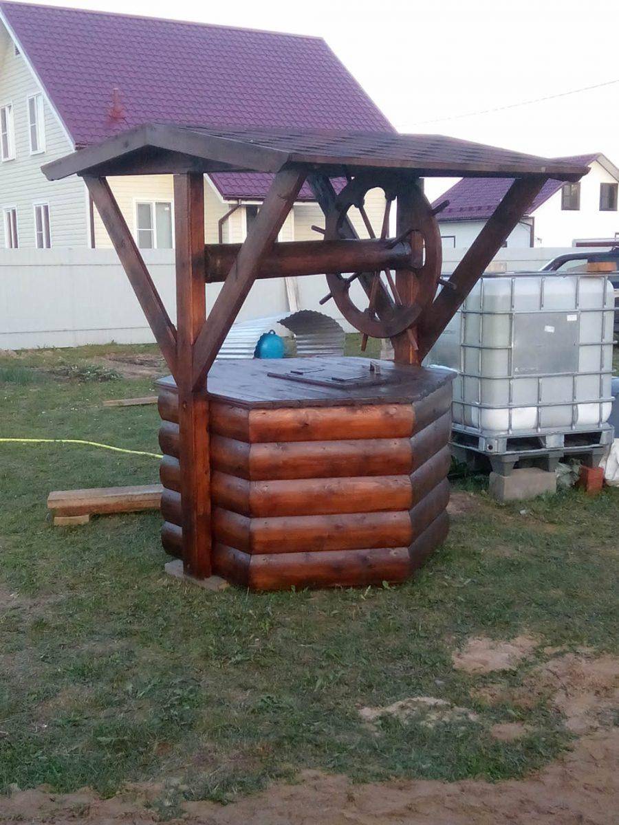 Самые популярные – это так называемые русские колодцы, состоящие из основания и барабана над ним. Барабан крутится вручную, чтобы достать ведро с водой. Сверху строится двускатная крыша.