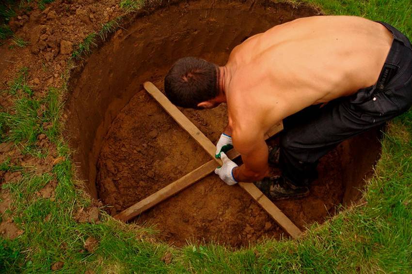 - Разметка участка. Если внешний диаметр бетонного кольца равен 1160 мм, следует делать разметку на 200-300 мм больше. Главное, чтобы кольцо свободно проникало в колодец. Размечается будущая шахта с помощью крестовины из 2 досок.