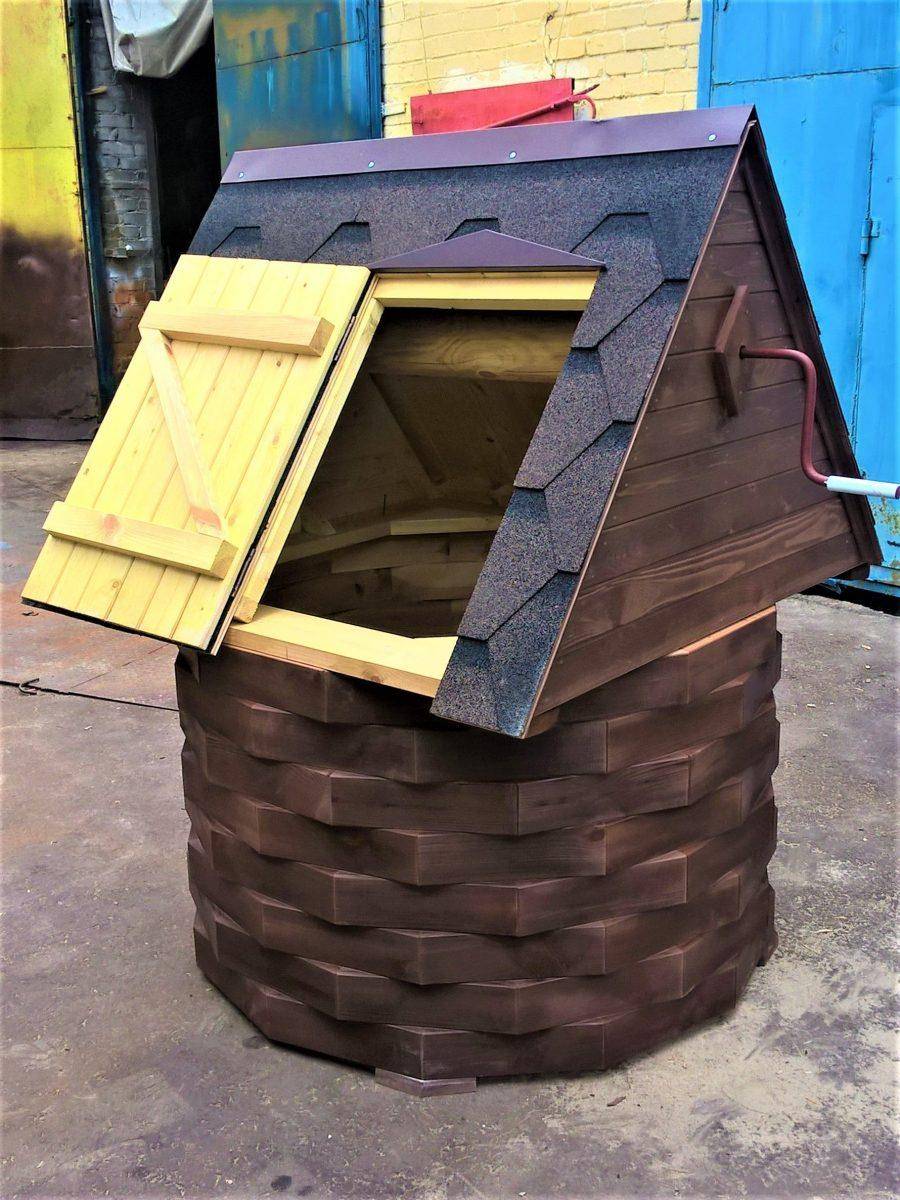 Оптимальная высота для данного сооружения составляет приблизительно 0,8-0,9 м, а минимальная – 60 см. Строить домик ниже последней величины попросту не имеет смысла, так как он будет вызывать неудобства при эксплуатации. Оголовок состоит из крышки, которая защищает воду в колодце, и подъемного механизма (для ведра). Последний может быть как ручным, так и автоматическим, что зависит от предпочтений хозяев участка.