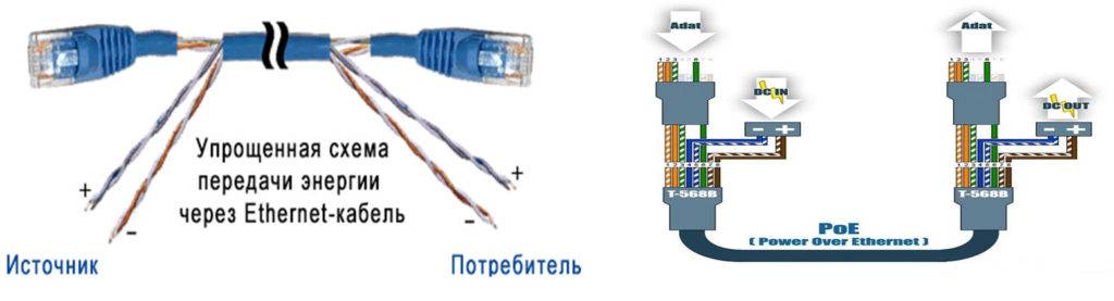Данная схема, выполненная по технологии РоЕ, позволяет не только передавать информационные сигналы, но и подводить питание на роутер, свитч, адаптер и другие устройства. Например, при подключении видеокамер не требуется отдельного питающего провода. Таким образом, коннектор объединяет в себе сразу две функции – передачу данных и питание устройства. Напряжение в такой распиновке поступает по проводникам синего и коричневого цветов.