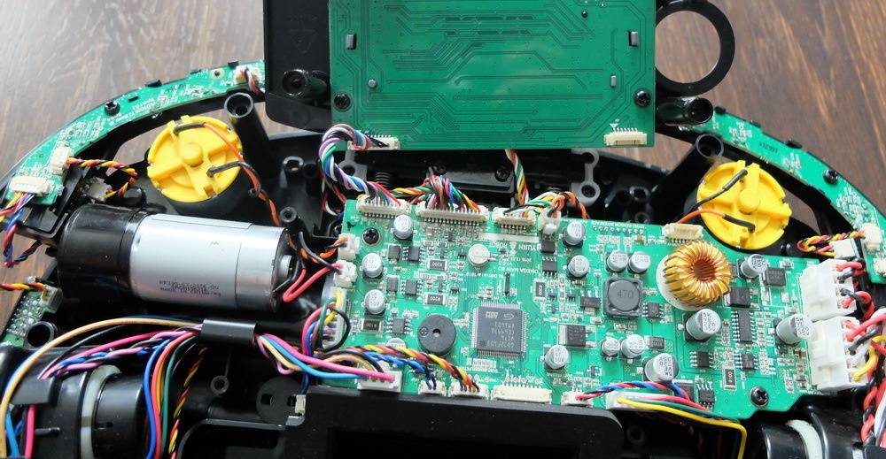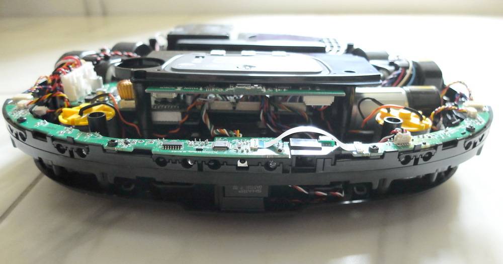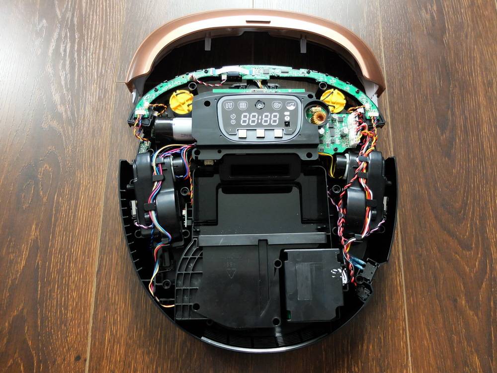 В нижней части корпуса находятся контактные пластины зарядного устройства, датчики определения уровня пола, энкодер, измеряющий пройденное передним колесом расстояние (одометр), датчик магнитной ленты-ограничителя. Одометр и датчик магнитной ленты работают по принципу эффекта Холла. Заглянем под крышку пылесоса и кратко пробежимся по основным блокам. Демонтировав верхнюю крышку и передний бампер, получаем доступ к внутренней начинке робота. Сразу в глаза бросаются следующие элементы: ведущие колеса, блок двигателя, отсек аккумулятора, сенсорный экран (под которым расположена материнская плата) и плата с датчиками на переднем бампере. По центру располагается пылесборник.