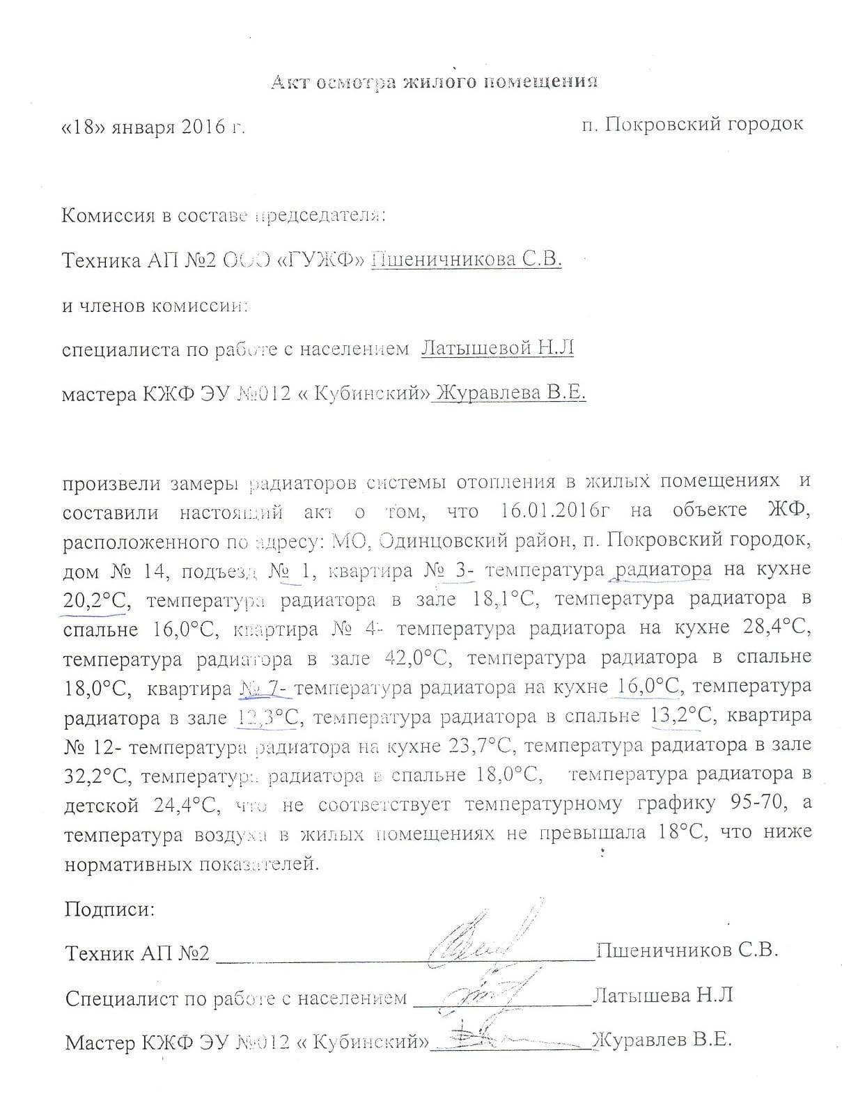 Пример акта, фиксирующего замеры температуры воздуха в квартире
