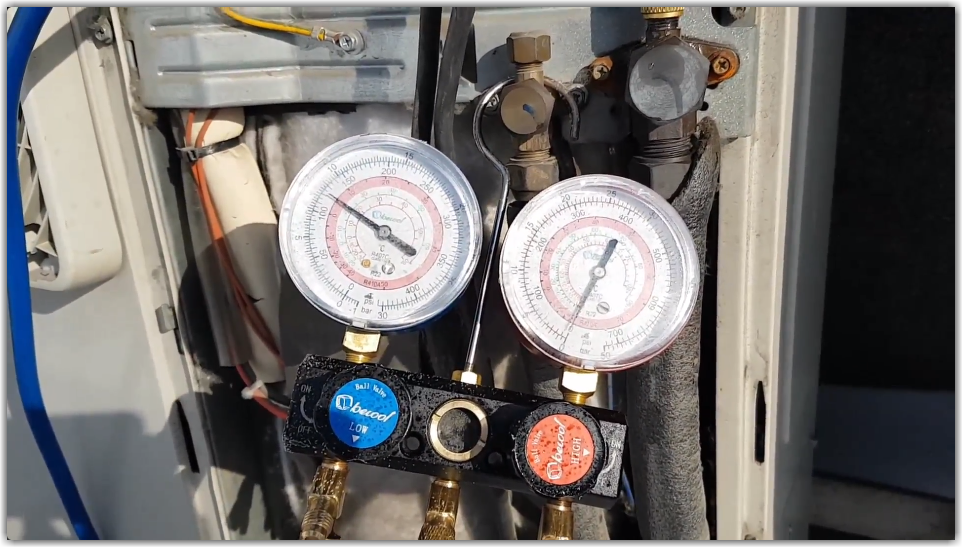 Измерить давление в кондиционере можно с помощью манометрической станции. Шланг станции подключают к внутренней магистрали и запускают прибор.