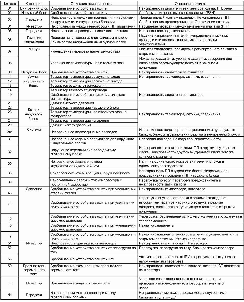 Коды ошибок климатической техники