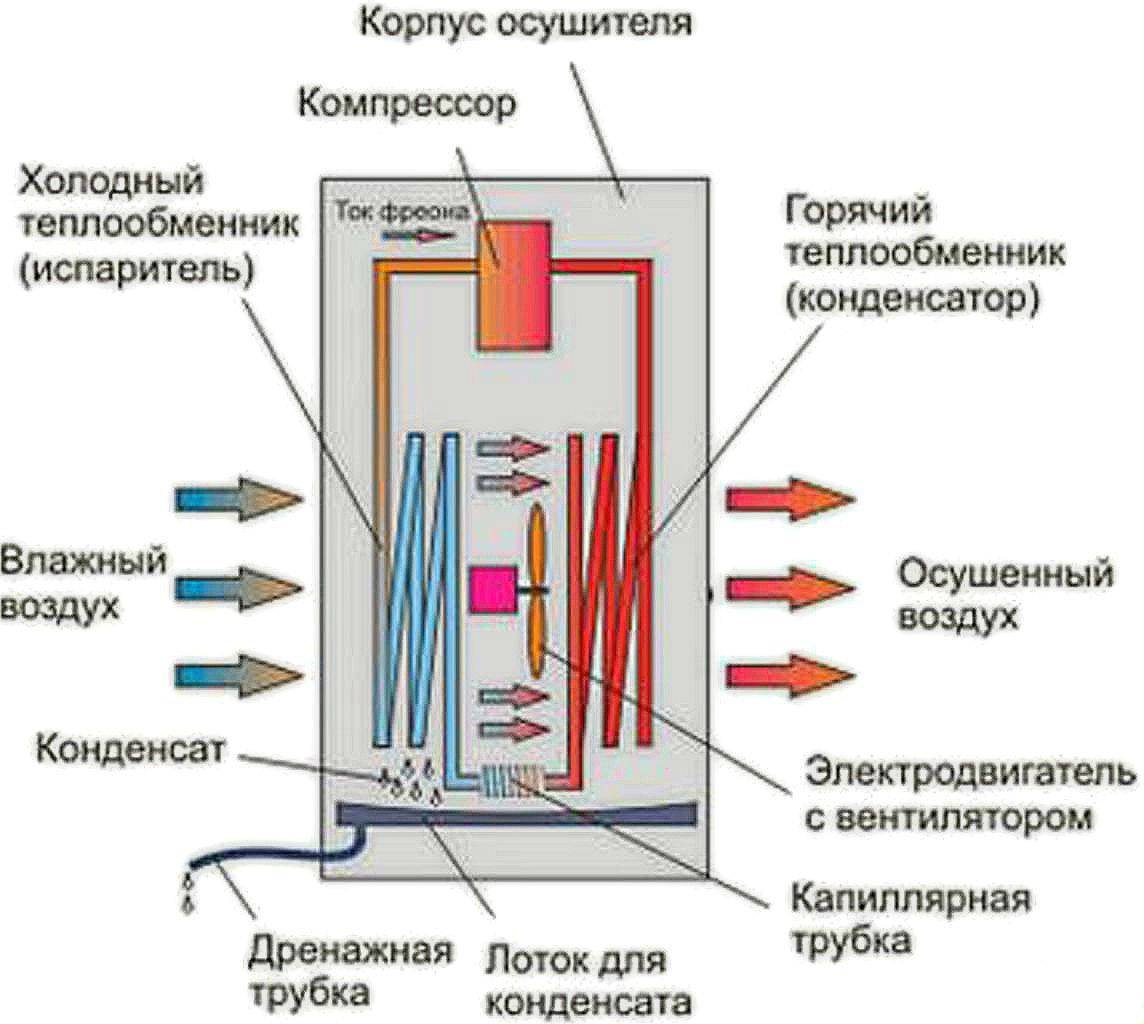 Принцип работы простого влагоудалителя заключается в том, что забранный воздух проходит конденсацию в радиаторе (оснащен каждый настенный осушитель) и после удаления влаги, возвращается обратно в жилое помещение. Простое устройство выполняет возложенные на него функции без лишних затрат электроэнергии и денег.