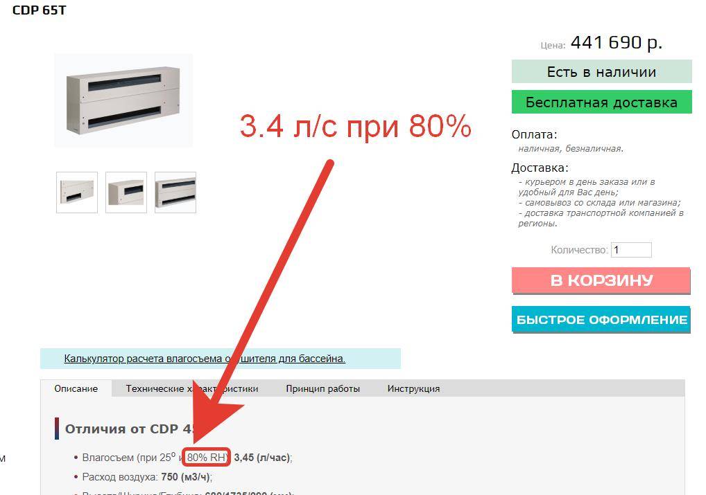 Производитель указывает мощность осушителя из расчета не на 50-60%, а на все 80%, что приводит к фиктивно завышенной мощности оборудования в 1.5 раза.