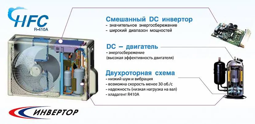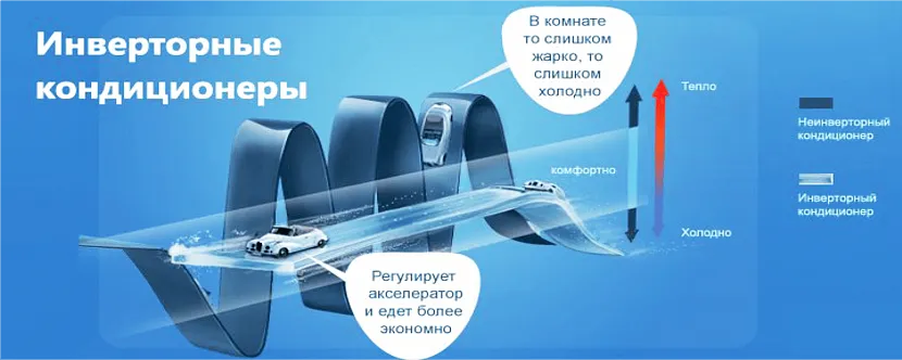 Если обычные кондиционеры при достижении заданной пользователем температуры в помещении отключаются, то инверторные устройства автоматически снижают скорость вращения вентилятора за счет плавного уменьшения мощности двигателя.