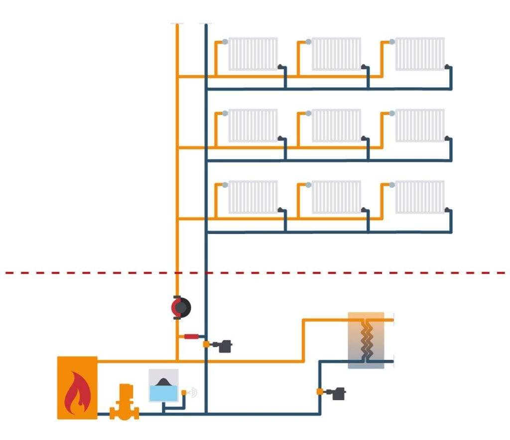 Двухтрубная – состоит из двух контуров (подающего и обратного), каждый из которых подводится ко всем батареям. Горячая жидкость быстро заполняет радиаторы и обеспечивает более равномерный нагрев. Схема походит даже для домов большой площади.