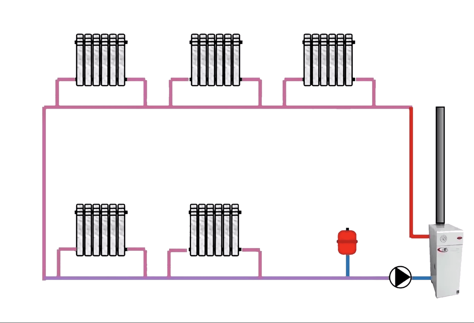Любая традиционная схема автономного отопления включает в себя котел, трубопровод (разводку), отопительные приборы.