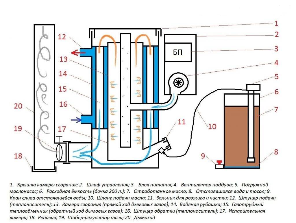 Схема устройства котла на отработанном масле с указанием всех основных и второстепенных элементов системы.