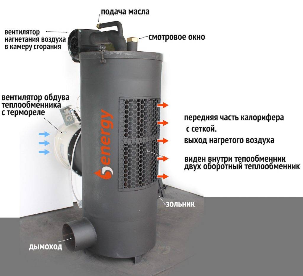Масляно-воздушная взвесь сгорает с образованием газообразных продуктов и выделением тепла. Дым с примесями и несгоревшими частицами удаляется по воздуховоду. Полученные калории используют для поддержания планируемых температур в помещении.
