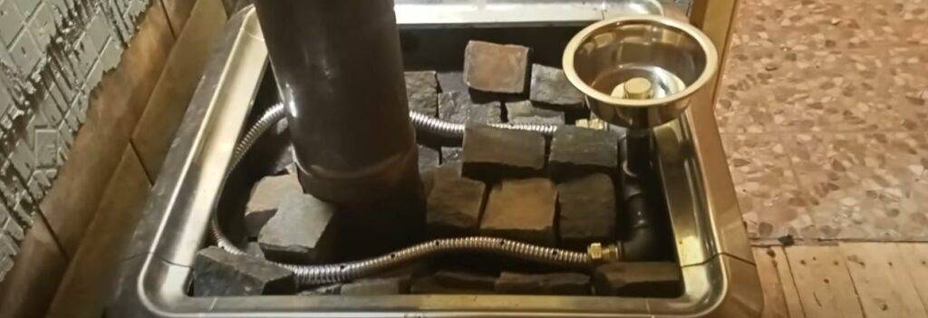 Расположенные вокруг трубы камни будут нагреваться примерно до +130…+180°, и жидкость будет испаряться, образуя достаточное количество пара. Так как пару потребуется определенное время, чтобы преодолеть слой камней, его температура станет оптимальной для парилки.