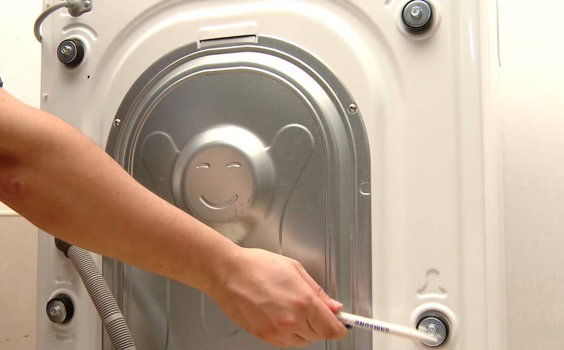 - Для решения вопроса с электродвигателем нужно снять заднюю панель и попробовать подтянуть крепежи. Также съем дальней крышки позволит определить состояние ремня, ведущего от двигателя к барабану. Иные действия с мотором и программируемой частью аппарата нельзя проводить самостоятельно.