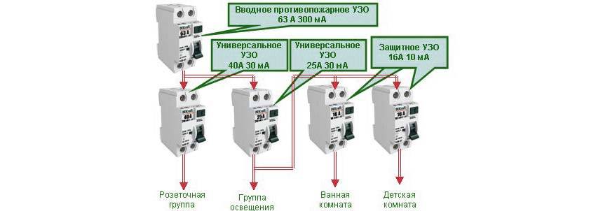 - надежность – аппарат первого уровня дублирует работу последующих УЗО и выключает энергию одновременно с ними;
