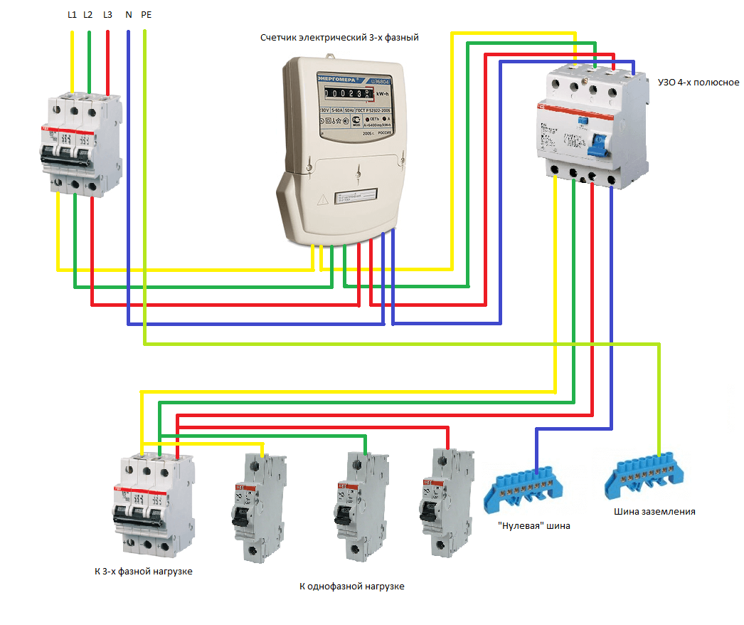 Соединяются водный автомат и силовой кабель, который проходит от внешней сети. Выбрать автомат можно правильно, учитывая показатель максимального электротока и суммарных нагрузок в сети; Далее подключается счетчик. Он потребуется, чтобы регистрировать энергозатраты, а так же для обеспечения УЗО напряжением; Теперь подключаем сам защитный механизм