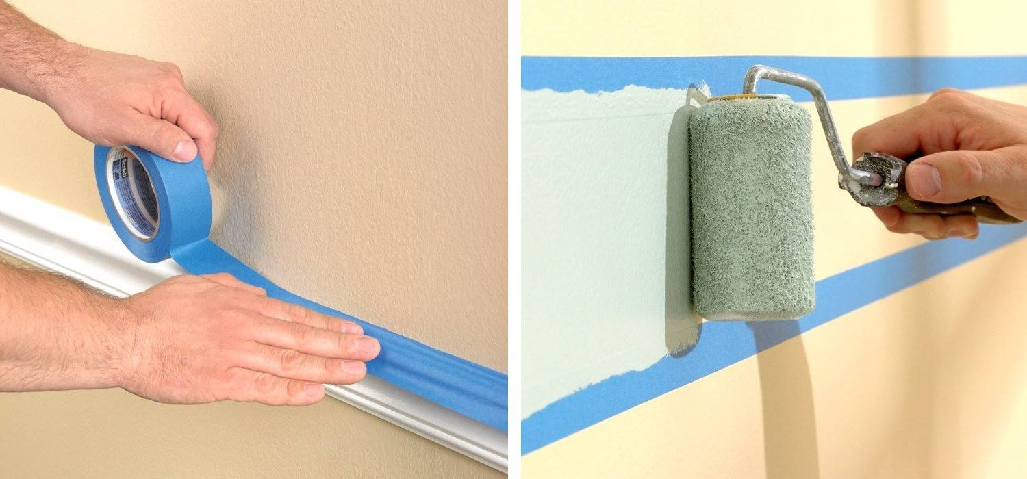 Не пренебрегайте наклеиванием малярной ленты по потолку, полу, смежной стене, если окраски по ней не будет.