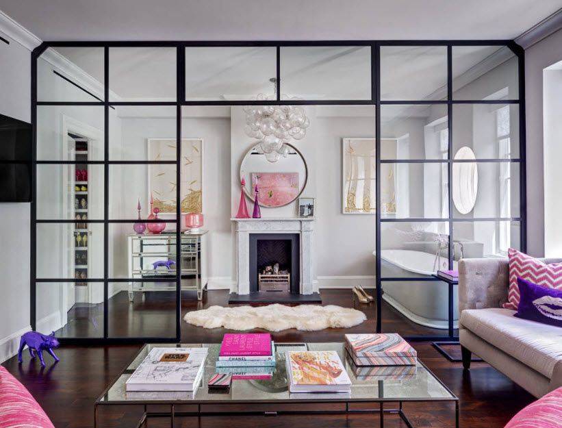 В частности, можно использовать ложные разделы. Они могут состоять из плотных или полупрозрачных штор, портьер и шарфов, полок с книгами и декоративными предметами или другой мебели, соответствующим образом размещенной на соответствующей стене.