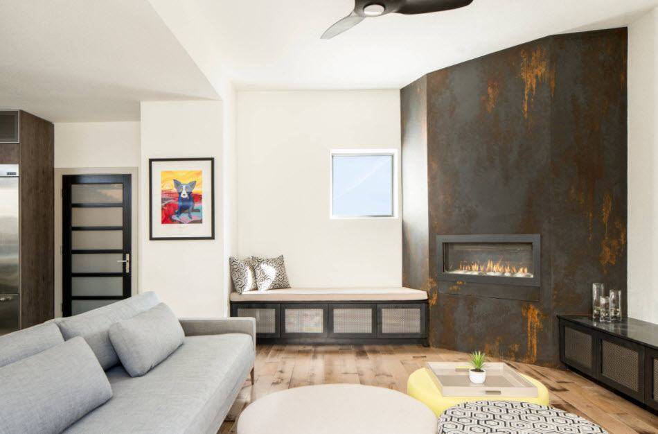 Использование такого стиля при оформлении гостиной будет интересным и оригинальным вариантом. На стенах можно создать эффект кирпичной кладки, состаривания, волн и т. д.